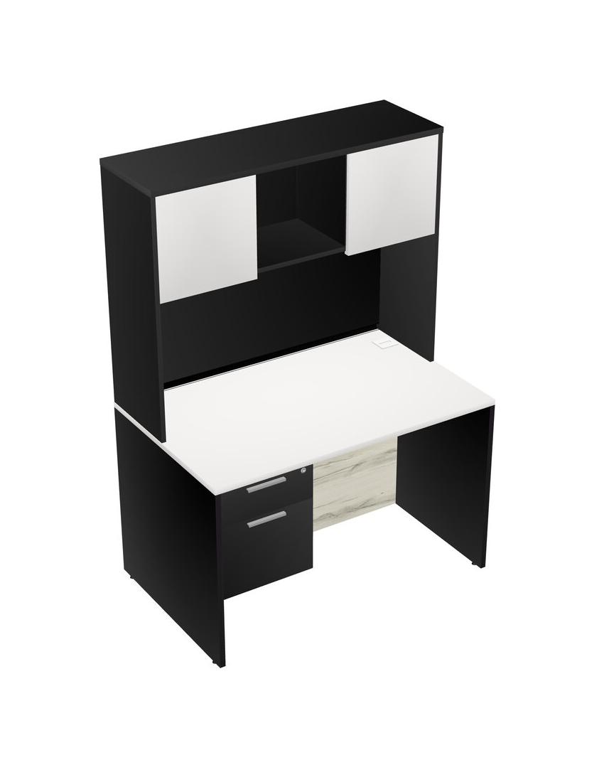 White Rectangular Office Desk Plus Black Hanging Drawers And Black Hutch