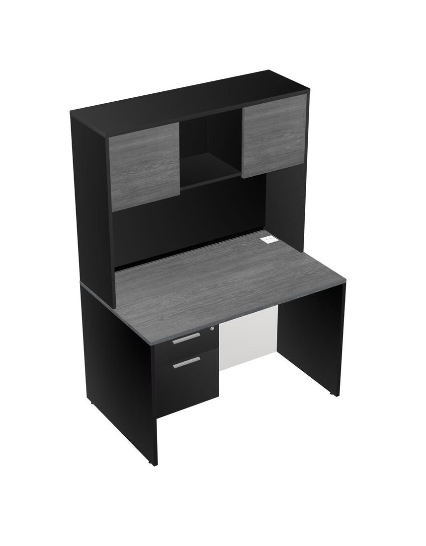 Grey Rectangular Office Desk Plus Black Hanging Drawers And Black Hutch