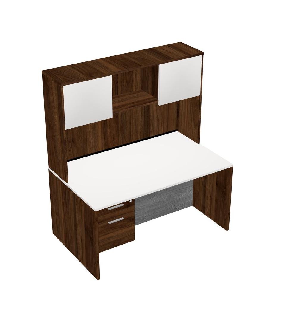 White Rectangular Office Desk Plus Columbia Walnut Hanging Drawers And Columbia Walnut Hutch