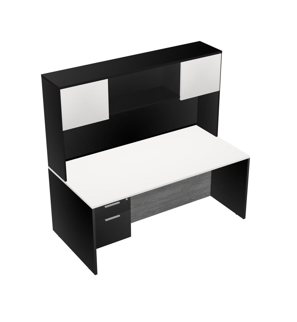 White Rectangular Office Desk Plus Black Hanging Drawers And Black Hutch