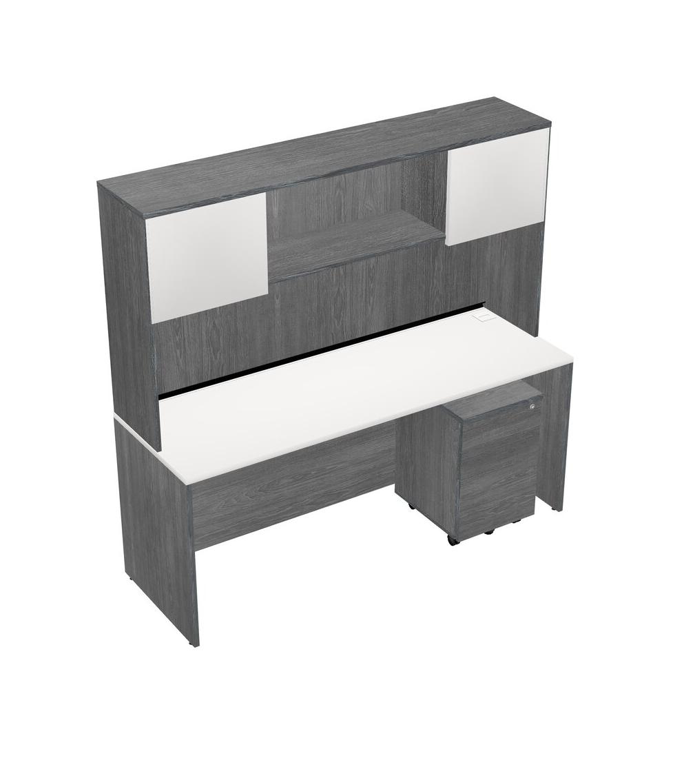 White Rectangular Office Desk Plus Grey Wooden Mobile Drawers And Grey Hutch