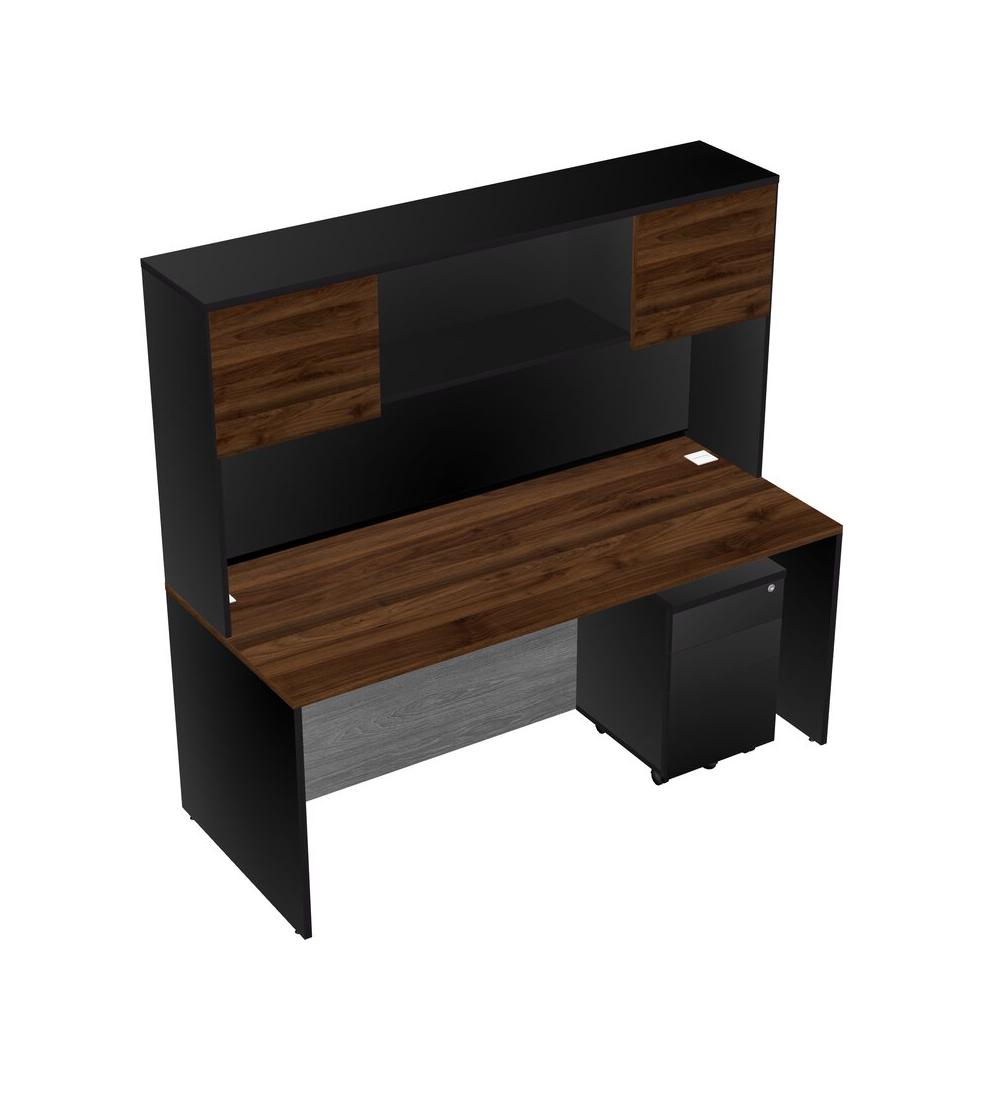 Columbia Walnut Rectangular Office Desk Plus Black Wooden Mobile Drawers And Black Hutch