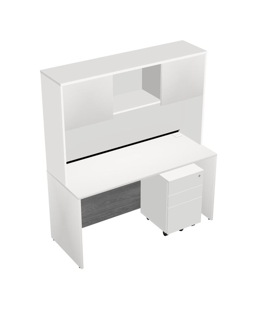 White Rectangular Office Desk Plus White Wooden Mobile Drawers And White Hutch