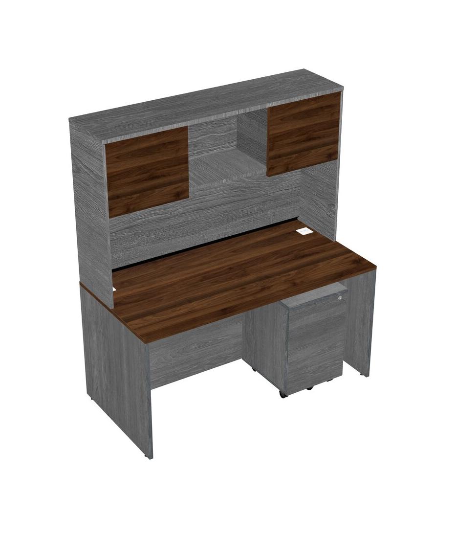 Columbia Walnut Rectangular Office Desk Plus Grey Wooden Mobile Drawers And Grey Hutch