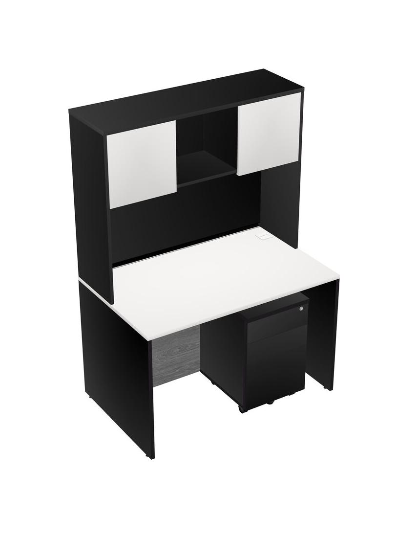 White Rectangular Office Desk Plus Black Wooden Mobile Drawers And Black Hutch