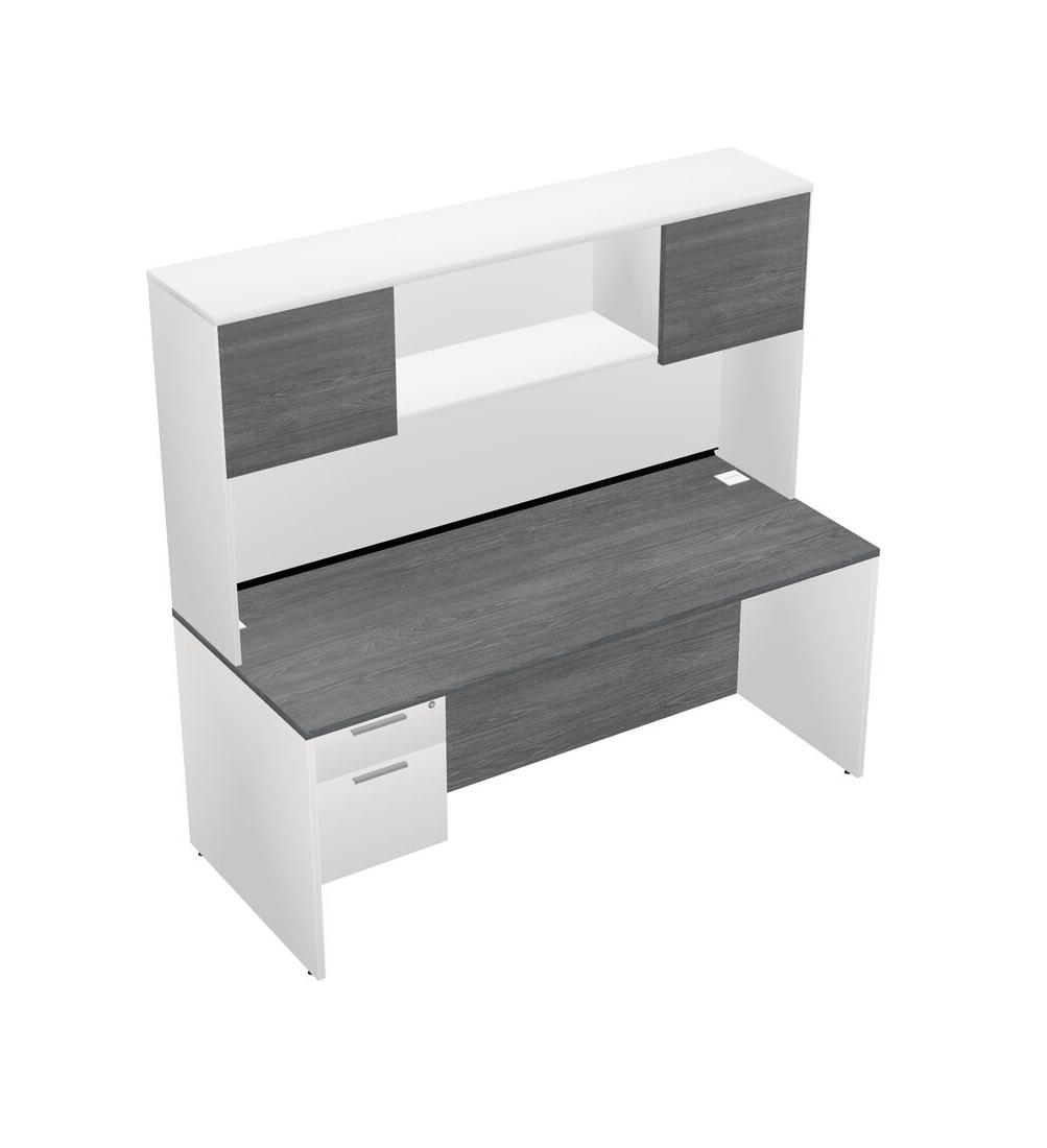 Grey Rectangular Office Desk Plus White Hanging Drawers And White Hutch