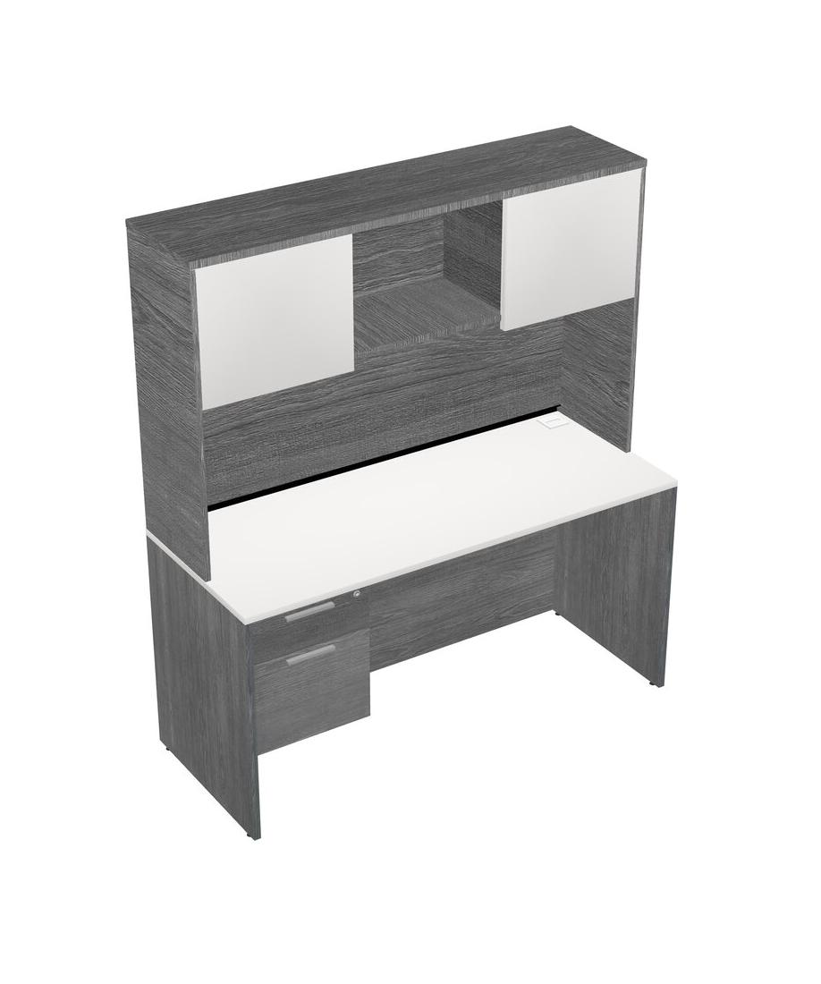 White Rectangular Office Desk Plus Grey Hanging Drawers And Grey Hutch