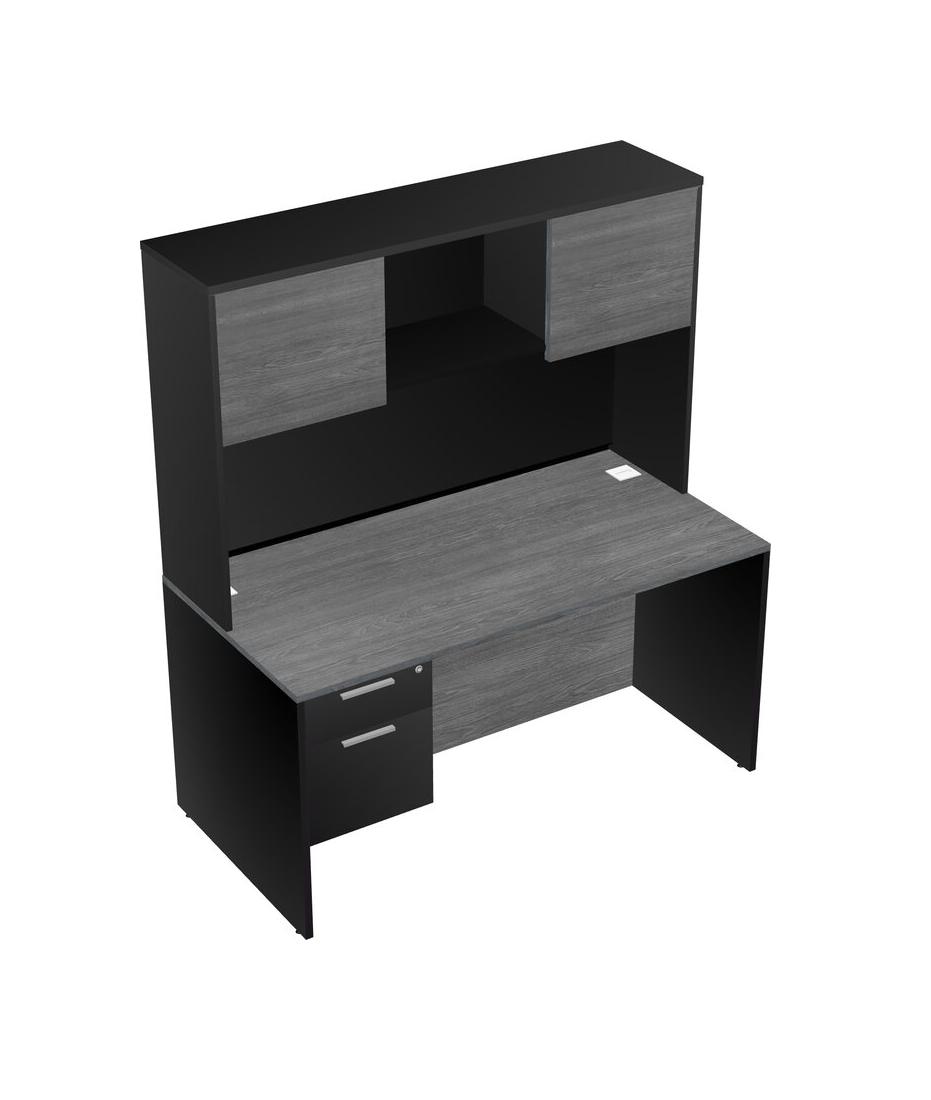 Grey Rectangular Office Desk Plus Black Hanging Drawers And Black Hutch
