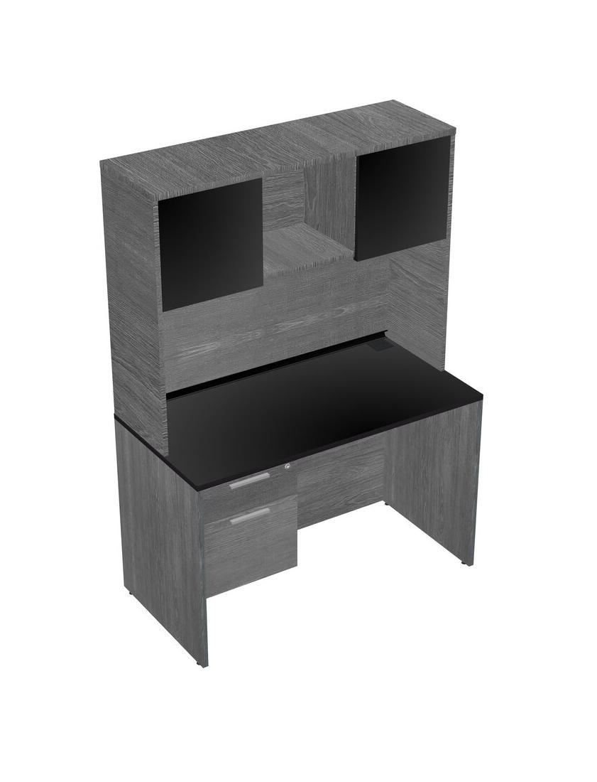 Black Rectangular Office Desk Plus Grey Hanging Drawers And Grey Hutch