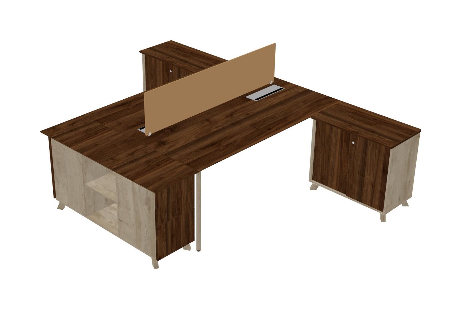 Slick Columbia Walnut Shared L-shaped Office Desk + Storage Cabinet + Desk Return + Raw Umber Desk Divider For 2 Persons