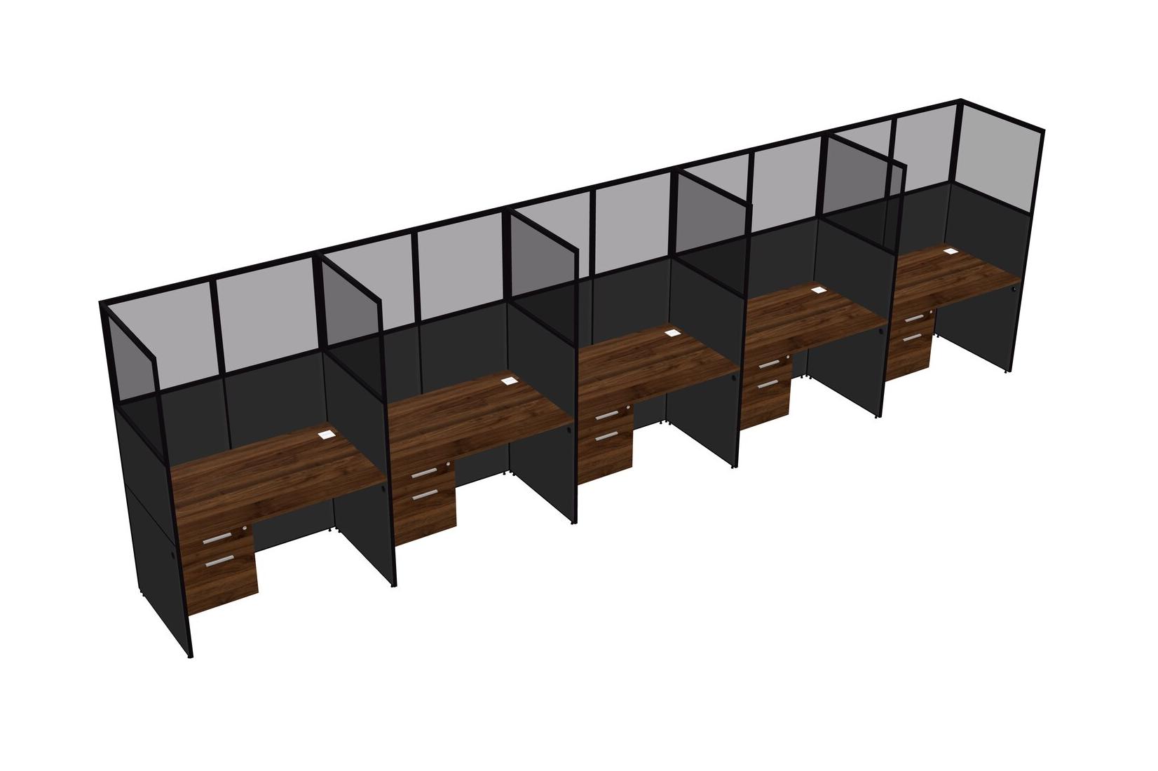 Columbia Walnut Shared Rectangular Office Cubicle Panel System With Hanging Drawers For 5 Persons