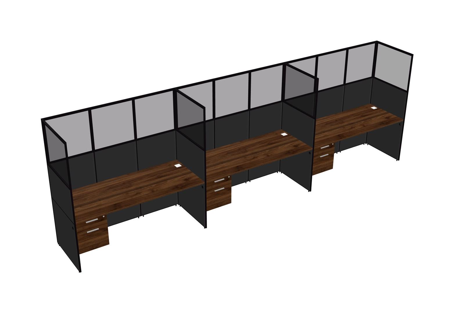 Columbia Walnut Shared Rectangular Office Cubicle Panel System With Hanging Drawers For 3 Persons