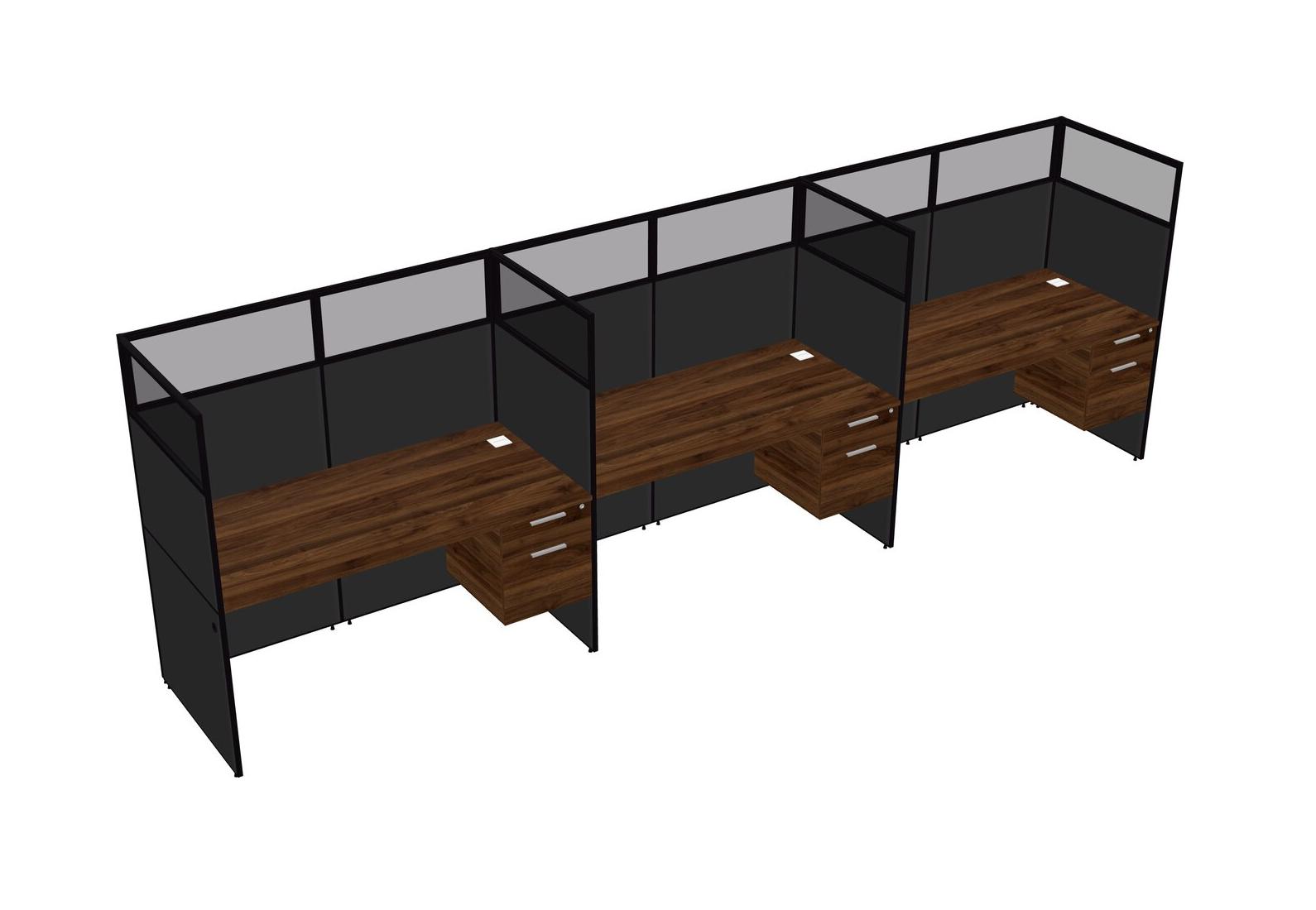 Columbia Walnut Shared Rectangular Office Cubicle Panel System With Hanging Drawers For 3 Persons