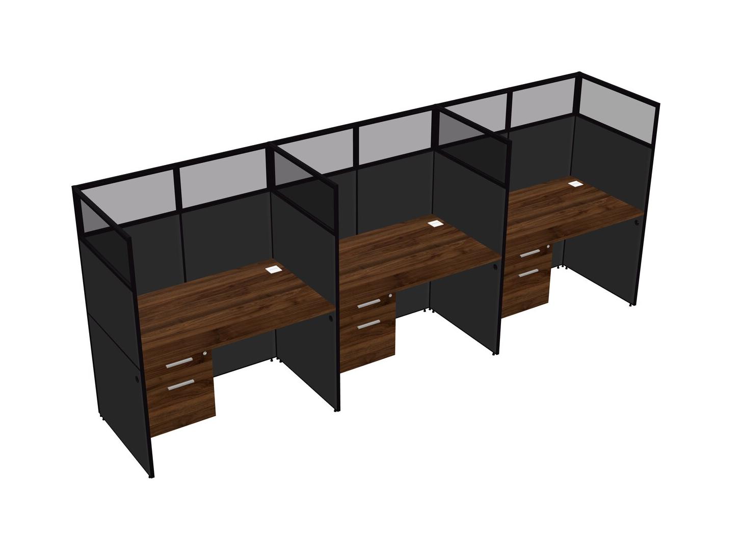 Columbia Walnut Shared Rectangular Office Cubicle Panel System With Hanging Drawers For 3 Persons
