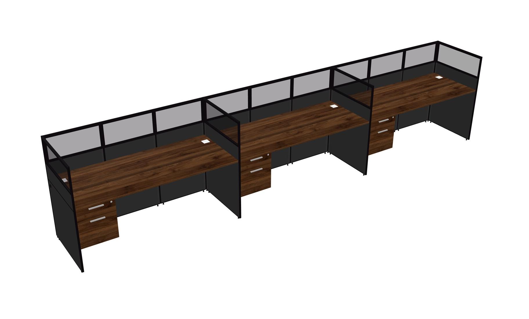 Columbia Walnut Shared Rectangular Office Cubicle Panel System With Hanging Drawers For 3 Persons