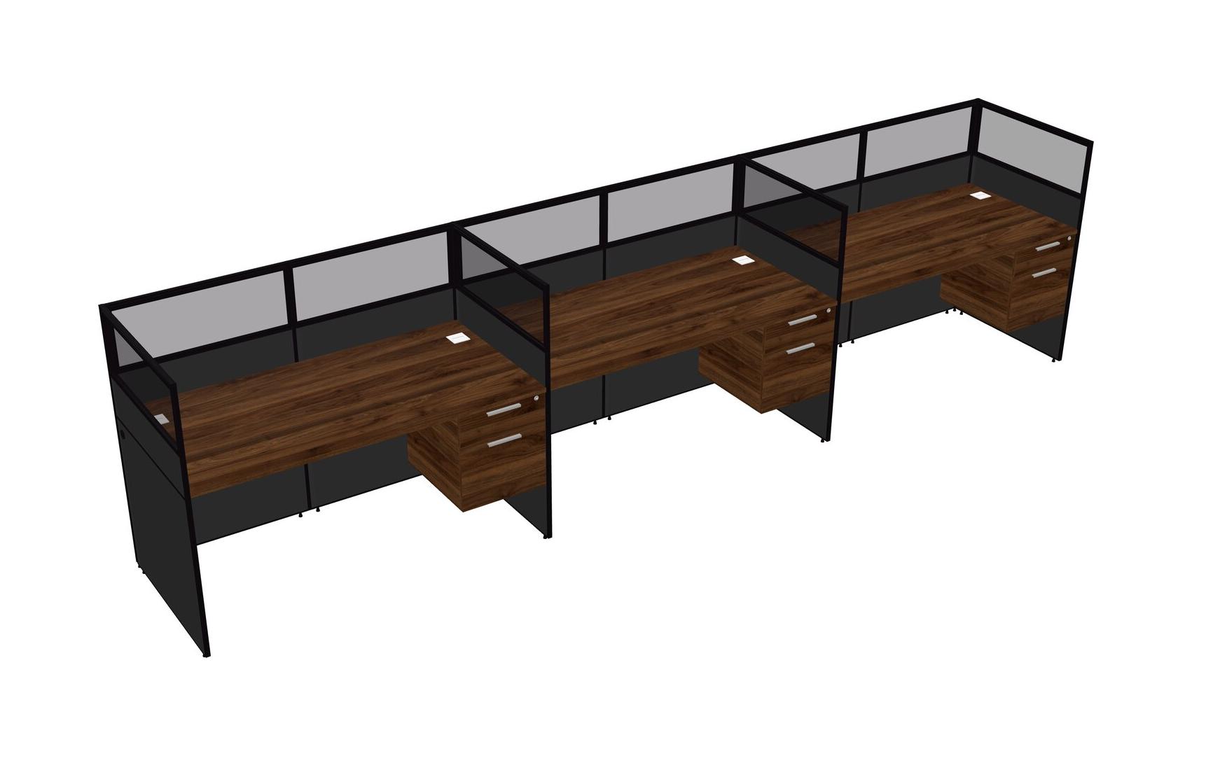 Columbia Walnut Shared Rectangular Office Cubicle Panel System With Hanging Drawers For 3 Persons