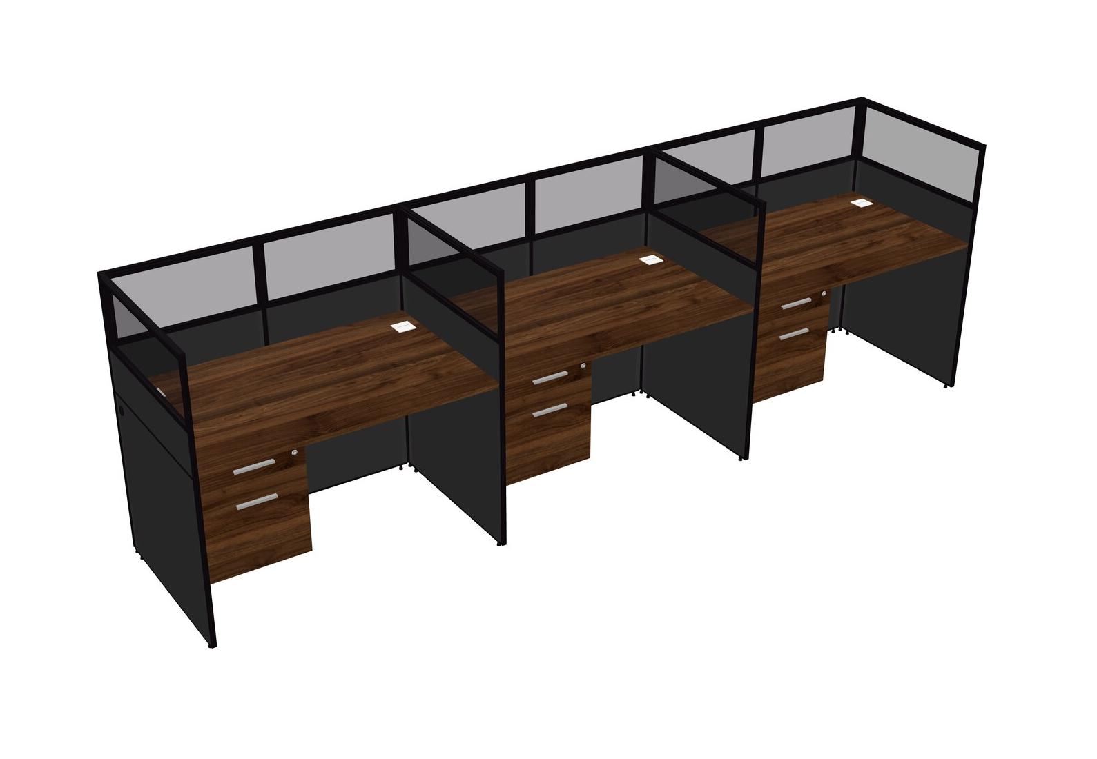 Columbia Walnut Shared Rectangular Office Cubicle Panel System With Hanging Drawers For 3 Persons