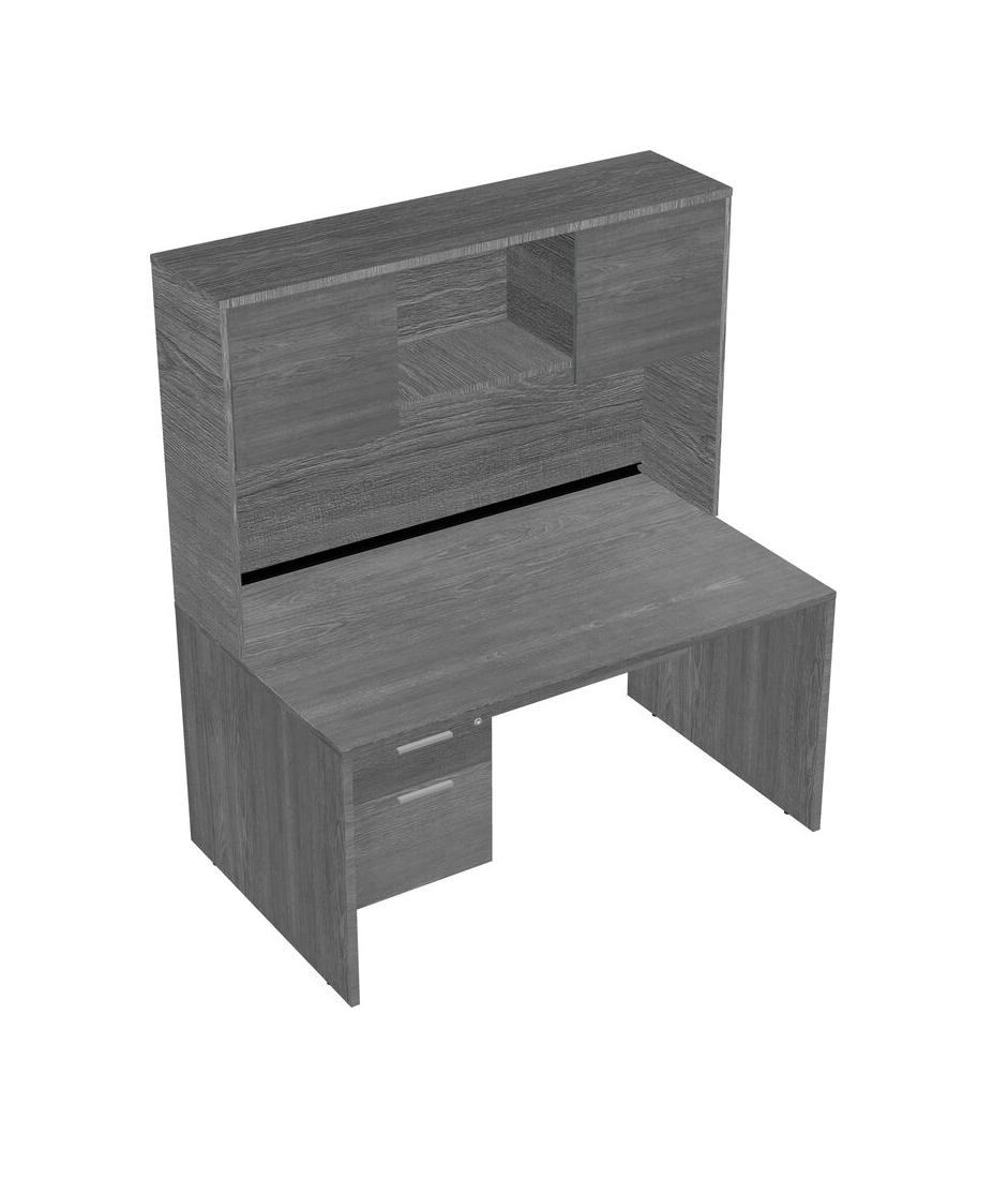 Grey Rectangular Office Desk Plus Grey Hanging Drawers And Grey Hutch