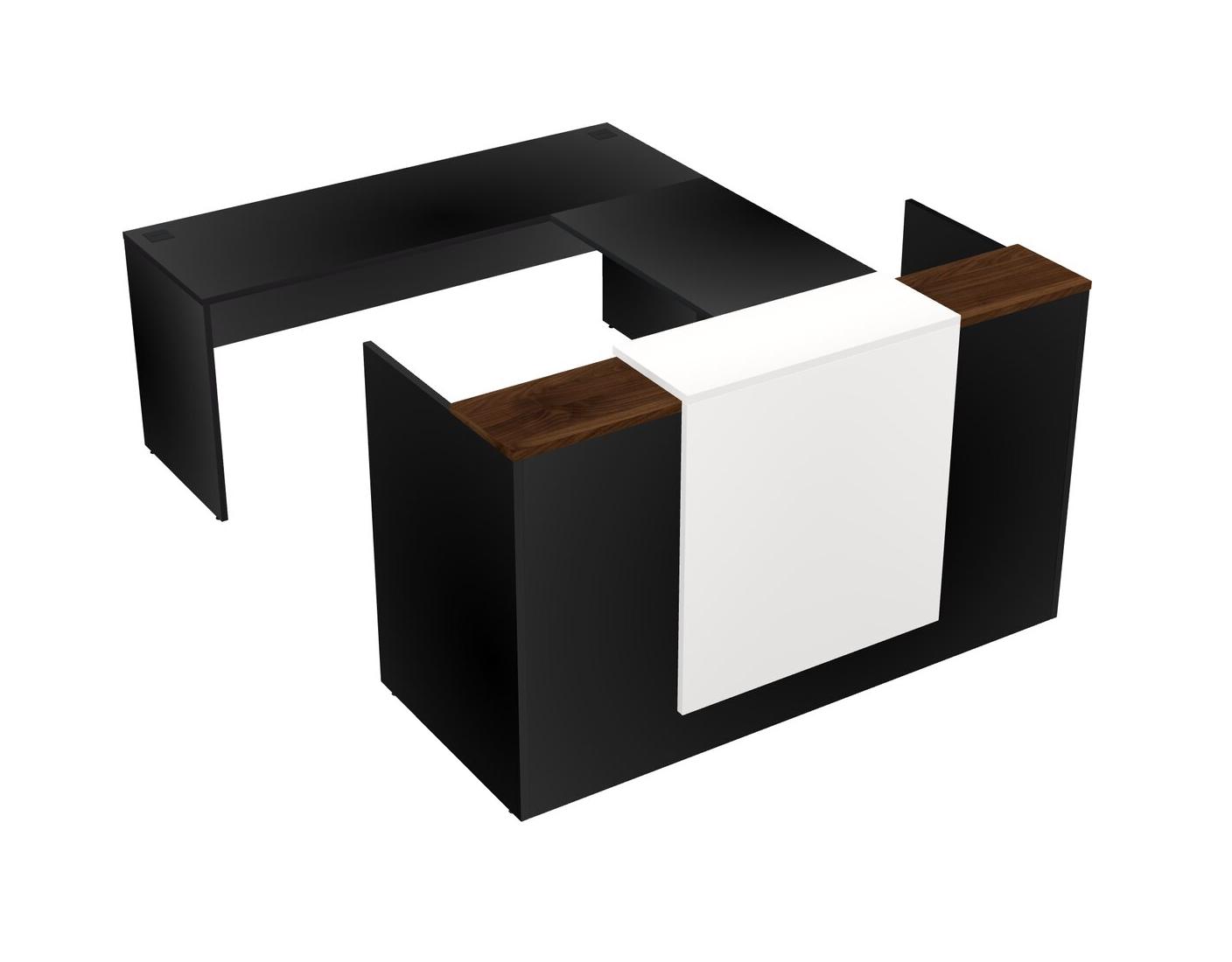 Columbia Walnut Modular Reception Desk + Wooden Mobile Drawers + Credenza Desk + Floating Counter