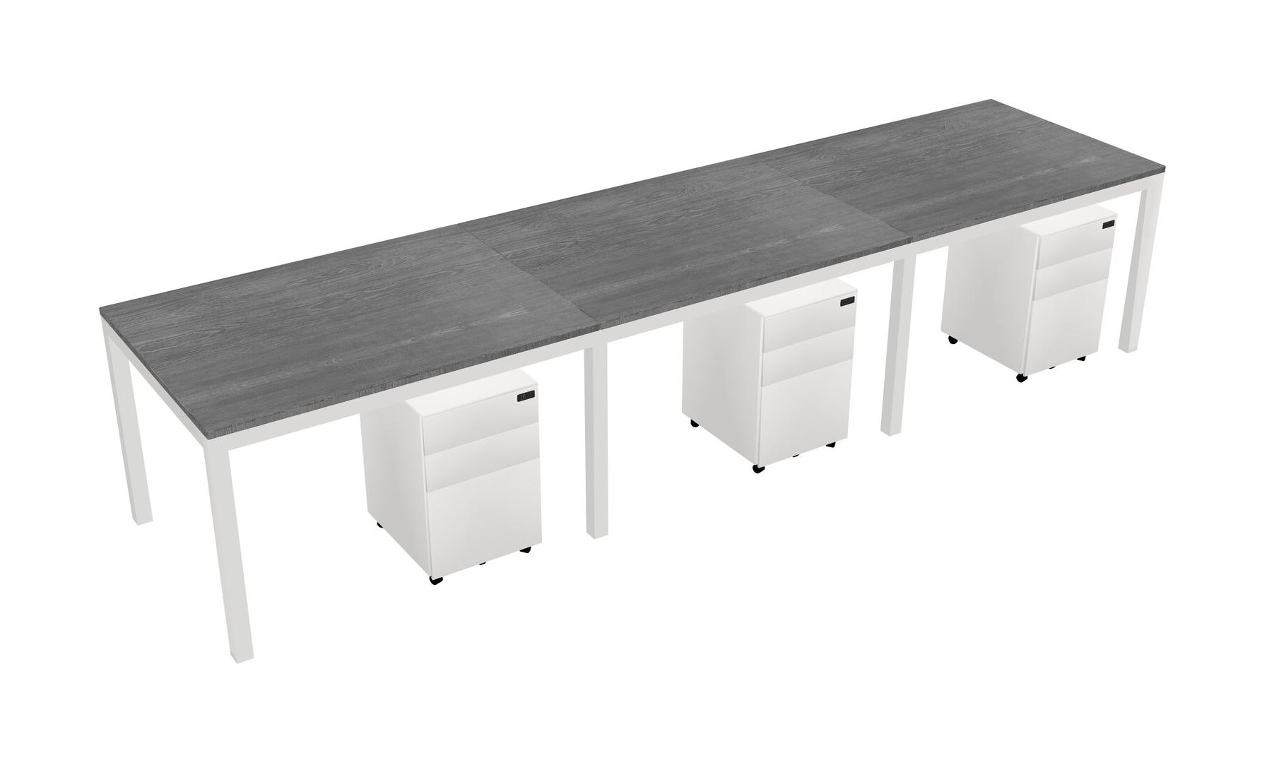 Grey Rectangular Office Desk With Metal Mobile Drawers For 3 Persons