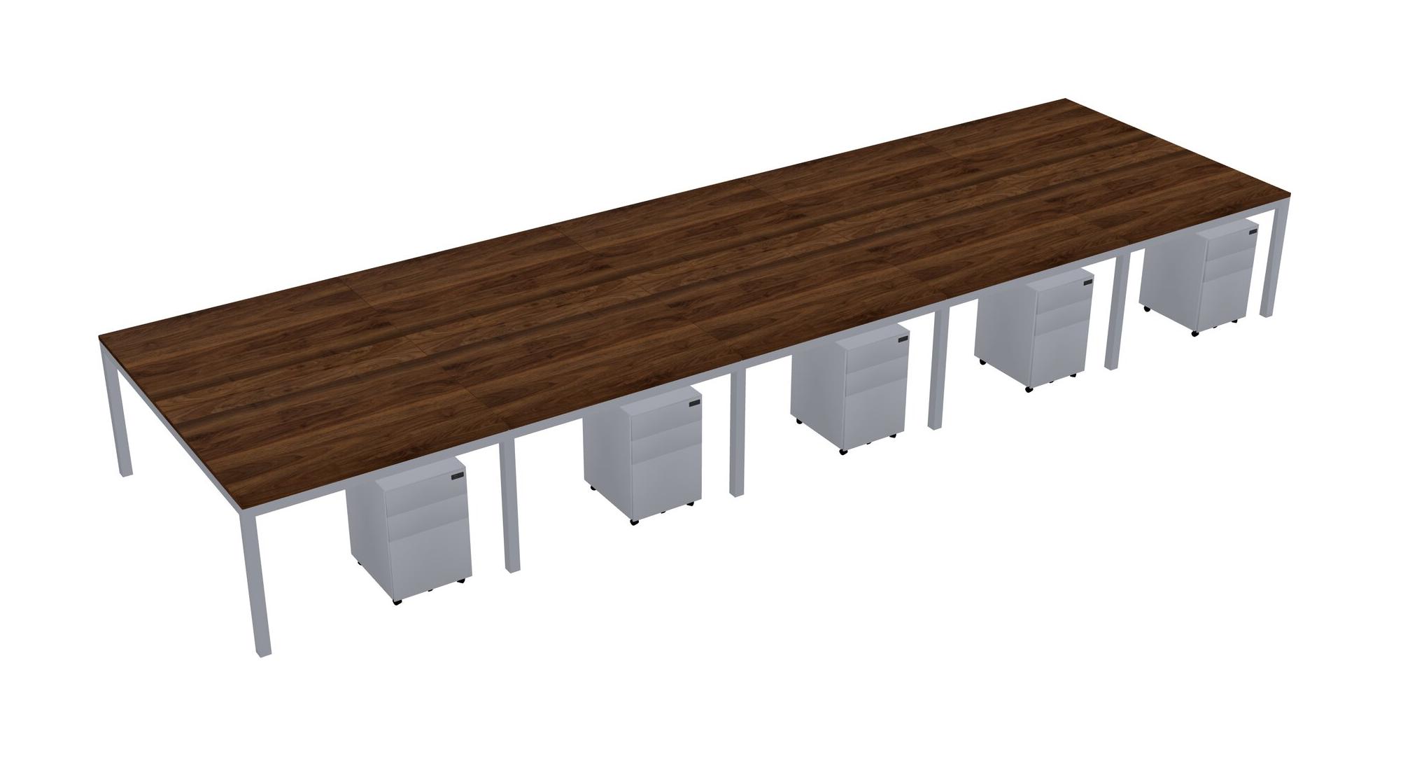 Columbia Walnut Shared Rectangular Office Desk With Metal Mobile Drawers For 10 Persons