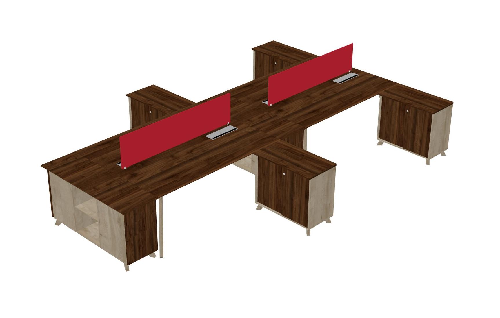 Slick Columbia Walnut Shared L-shaped Office Desk + Storage Cabinet + Desk Return + Cardinal Desk Divider For 4 Persons