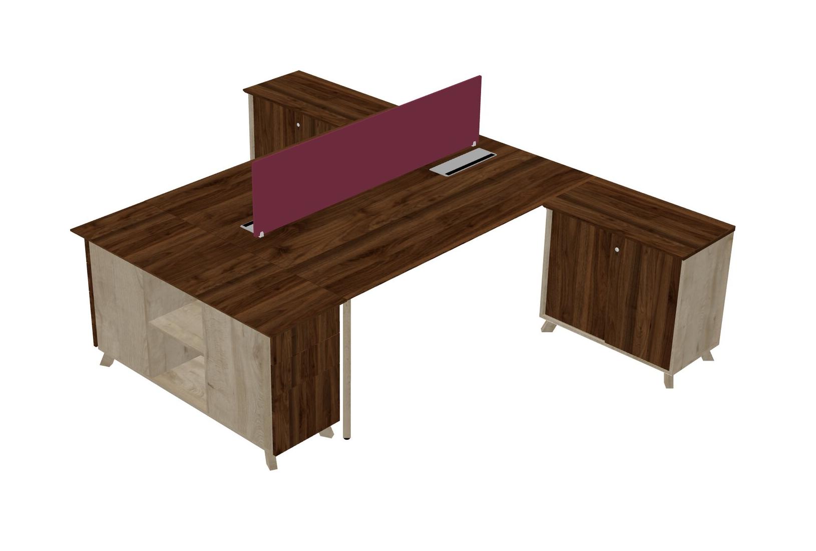 Slick Columbia Walnut Shared L-shaped Office Desk + Storage Cabinet + Desk Return + Camelot Desk Divider For 2 Persons