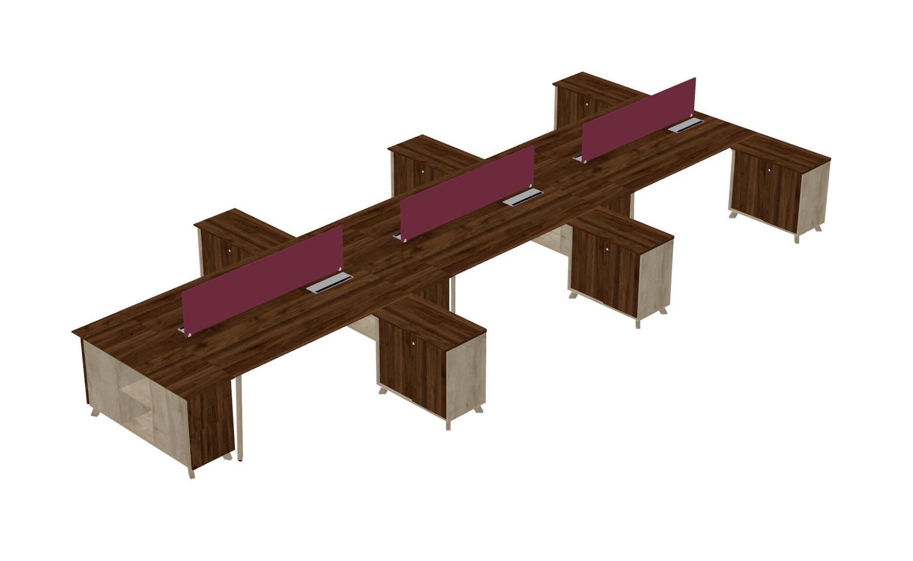 Slick Columbia Walnut Shared L-shaped Office Desk + Storage Cabinet + Desk Return + Camelot Desk Divider For 6 Persons