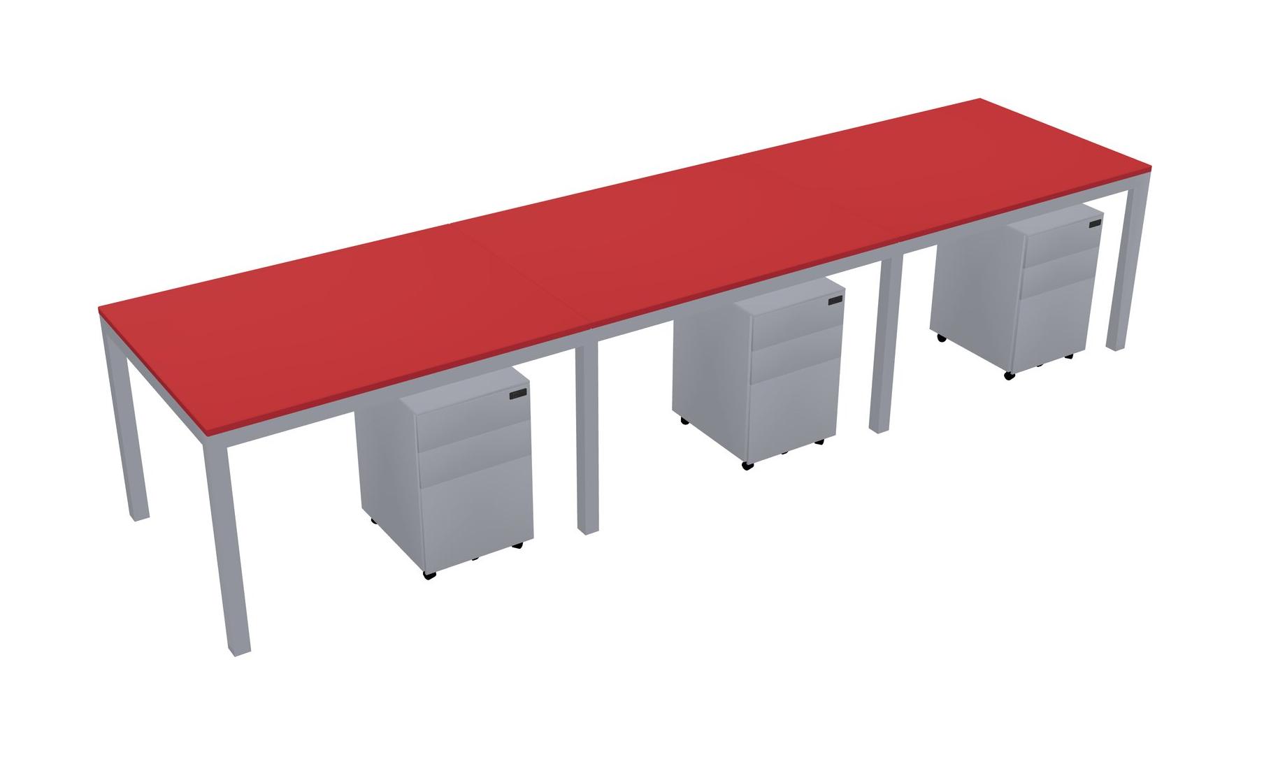 Prism Red Rectangular Office Desk With Metal Mobile Drawers For 3 Persons