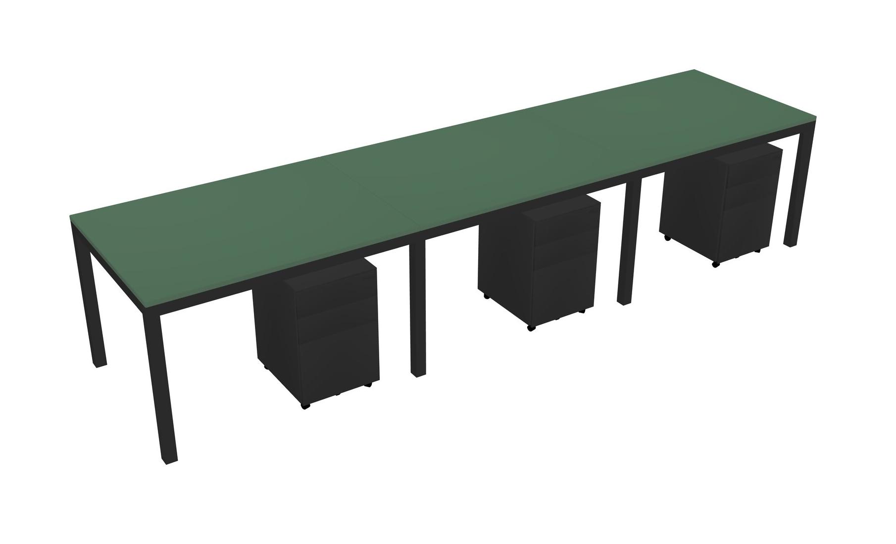 Green Rectangular Office Desk With Metal Mobile Drawers For 3 Persons