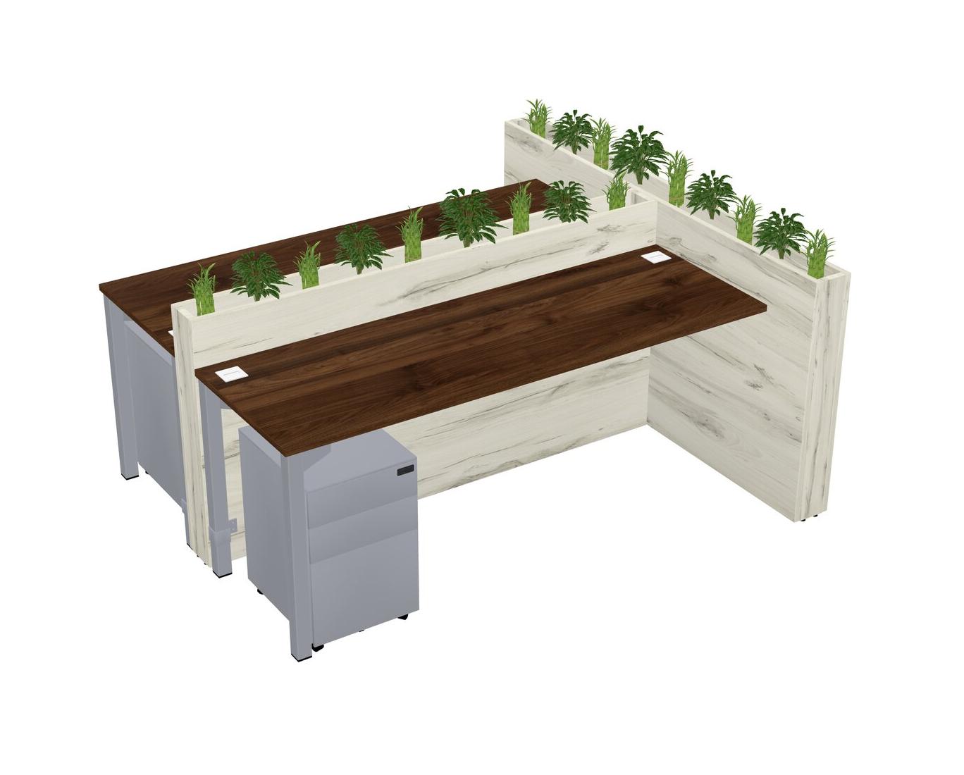 Columbia Walnut Rectangular Shared Office Desk System Metal Mobile Drawers (Pots & Plants Sold Separately)