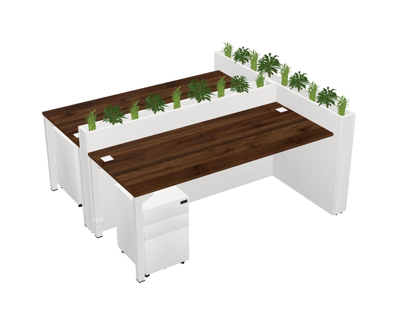 Columbia Walnut Rectangular Shared Office Desk System Metal Mobile Drawers (Pots & Plants Sold Separately)
