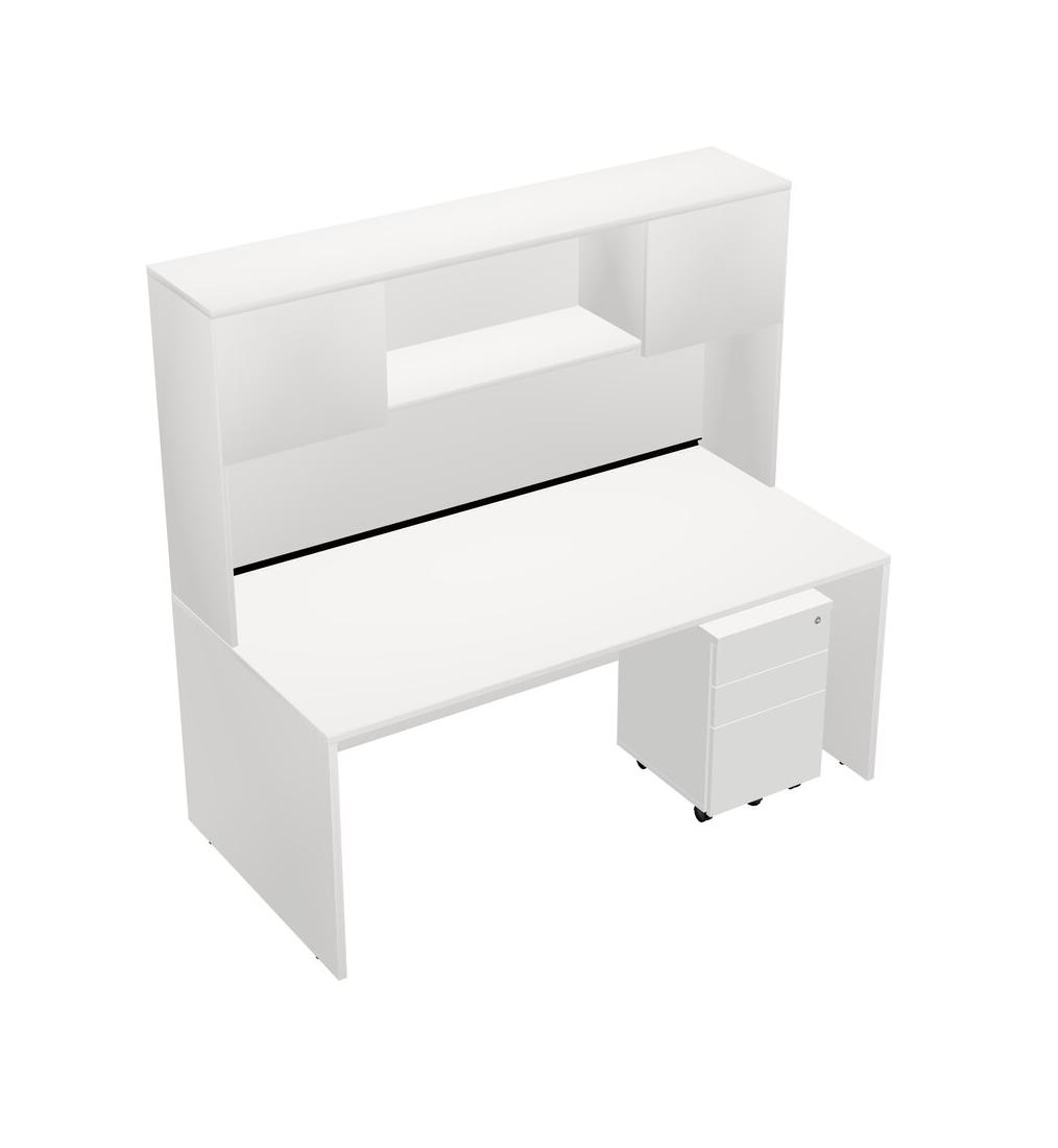 White Rectangular Office Desk Plus White Wooden Mobile Drawers And White Hutch