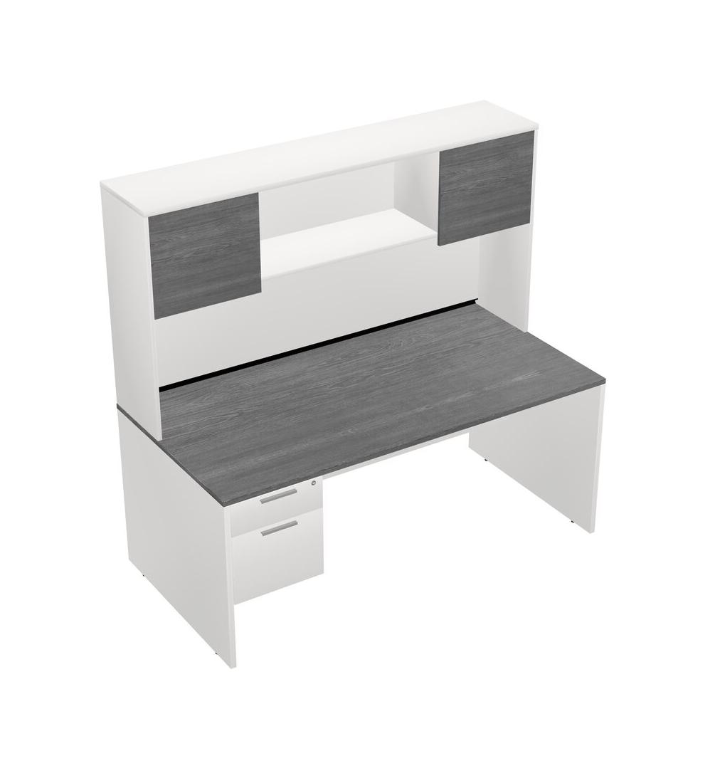 Grey Rectangular Office Desk Plus White Hanging Drawers And White Hutch