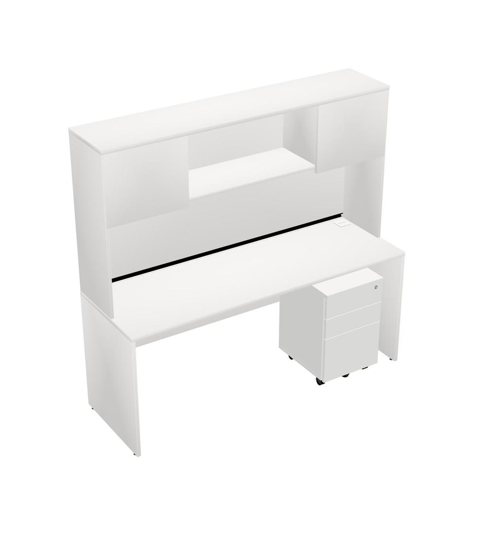 White Rectangular Office Desk Plus White Wooden Mobile Drawers And White Hutch