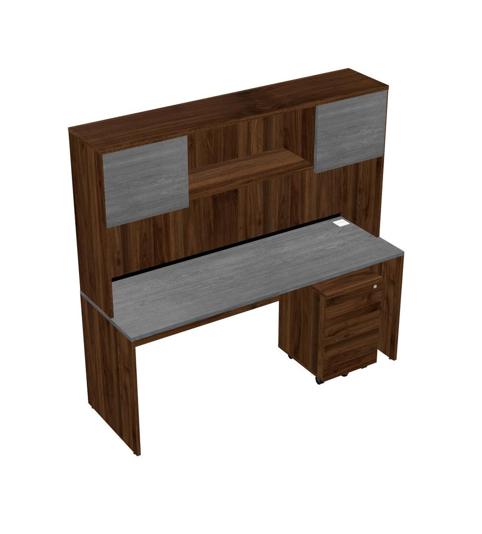 Grey Rectangular Office Desk Plus Columbia Walnut Wooden Mobile Drawers And Columbia Walnut Hutch