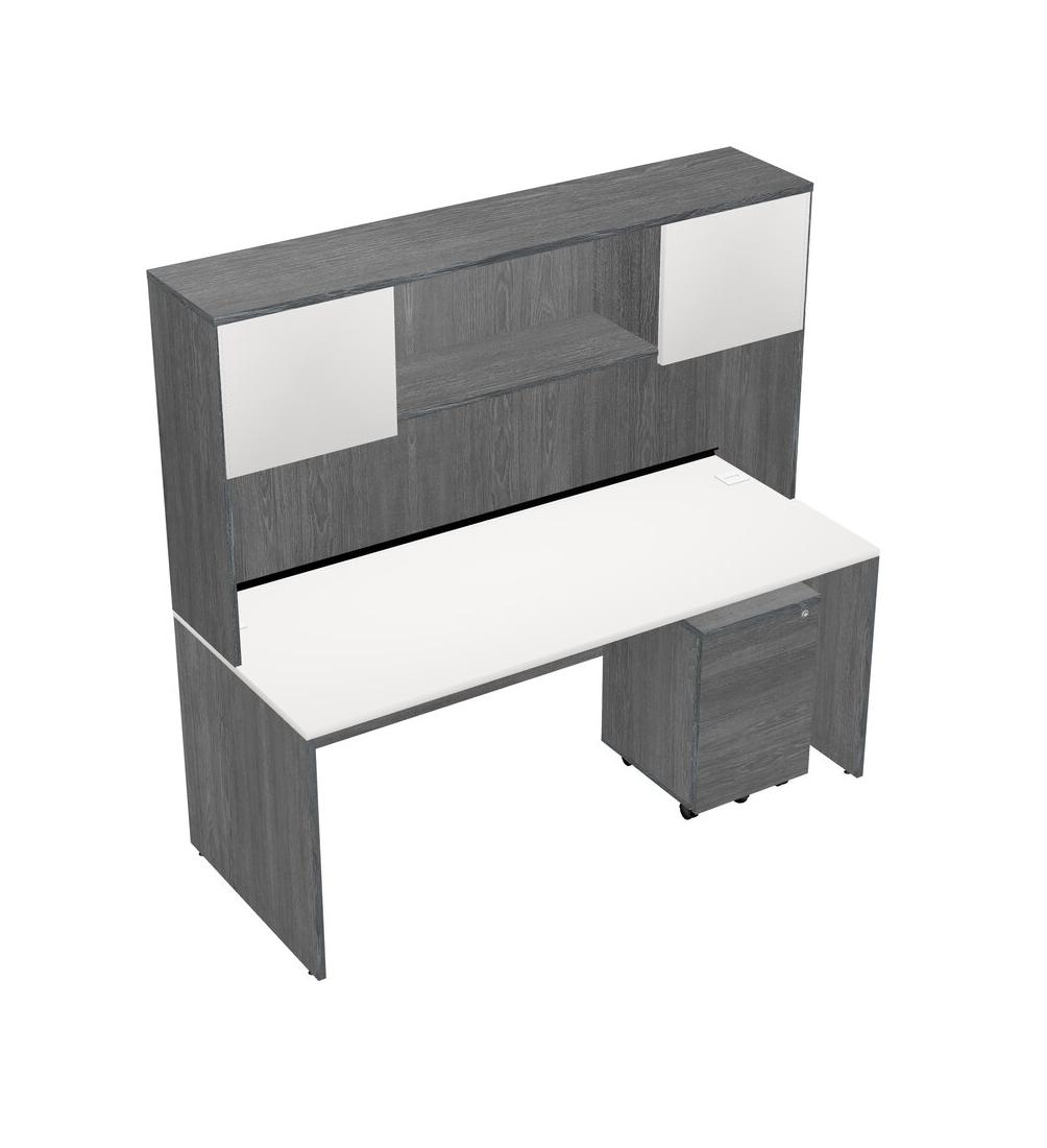 White Rectangular Office Desk Plus Grey Wooden Mobile Drawers And Grey Hutch