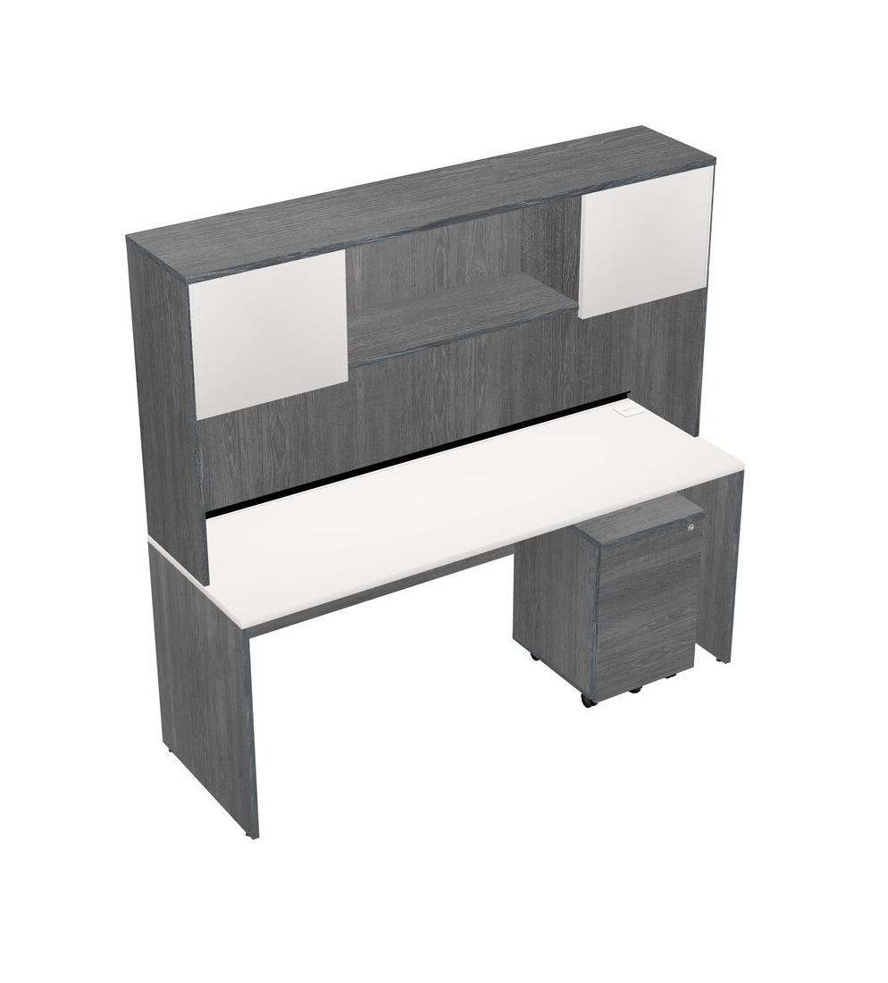 White Rectangular Office Desk Plus Grey Wooden Mobile Drawers And Grey Hutch