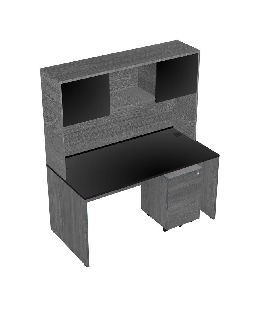 Black Rectangular Office Desk Plus Grey Wooden Mobile Drawers And Grey Hutch