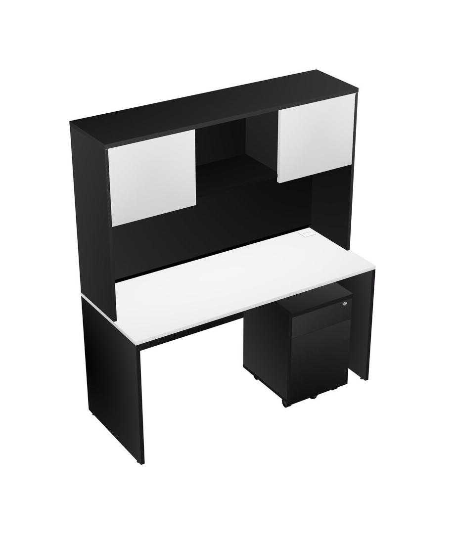 White Rectangular Office Desk Plus Black Wooden Mobile Drawers And Black Hutch