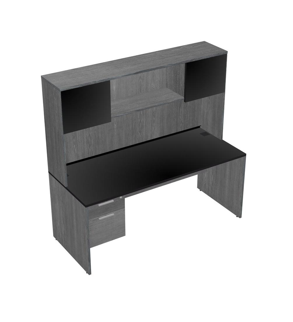 Black Rectangular Office Desk Plus Grey Hanging Drawers And Grey Hutch