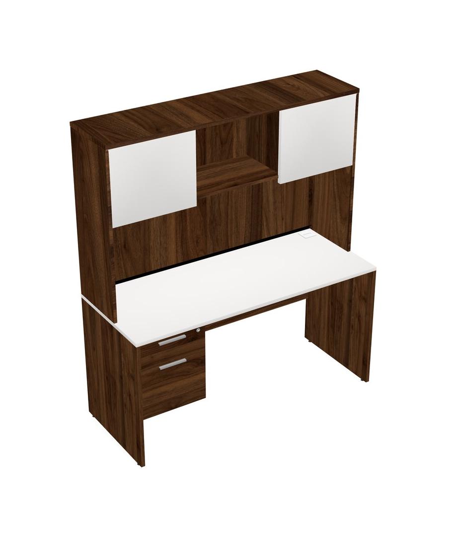 White Rectangular Office Desk Plus Columbia Walnut Hanging Drawers And Columbia Walnut Hutch