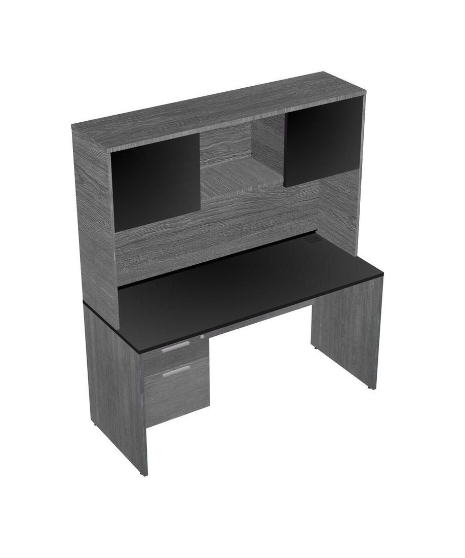 Black Rectangular Office Desk Plus Grey Hanging Drawers And Grey Hutch