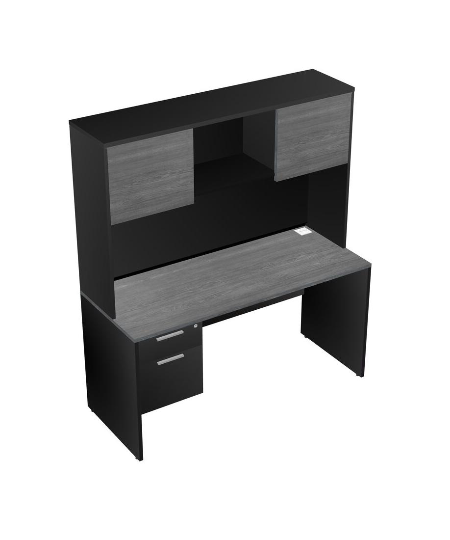 Grey Rectangular Office Desk Plus Black Hanging Drawers And Black Hutch
