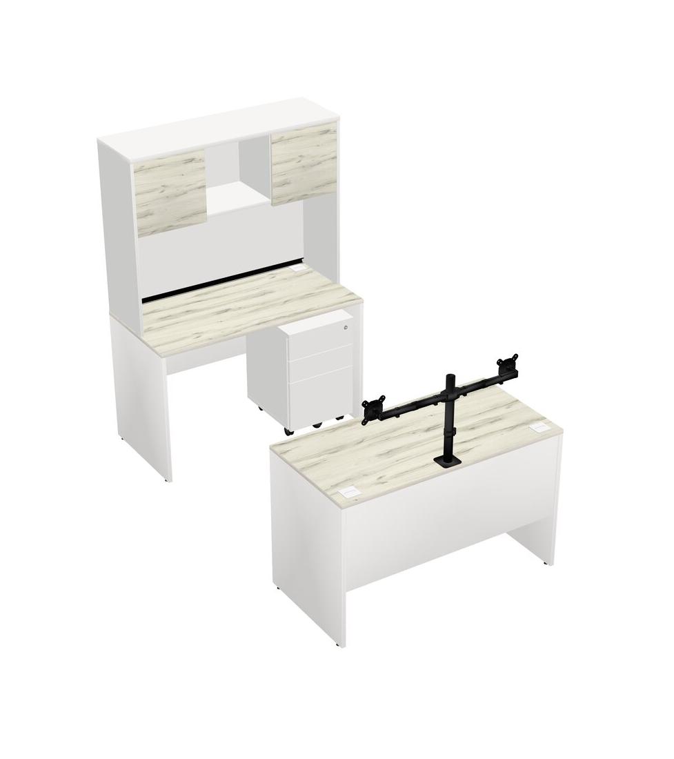 Office Parallel Desk Credenza Desk + Wooden Mobile Drawers + Hutch + Monitor Arm (double Arms)