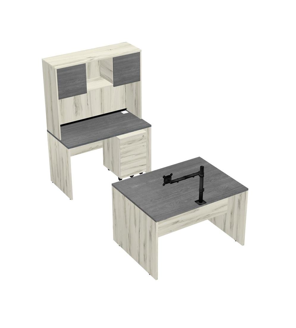 Office Parallel Desk Credenza Desk + Wooden Mobile Drawers + Hutch + Monitor Arm (single Arm)