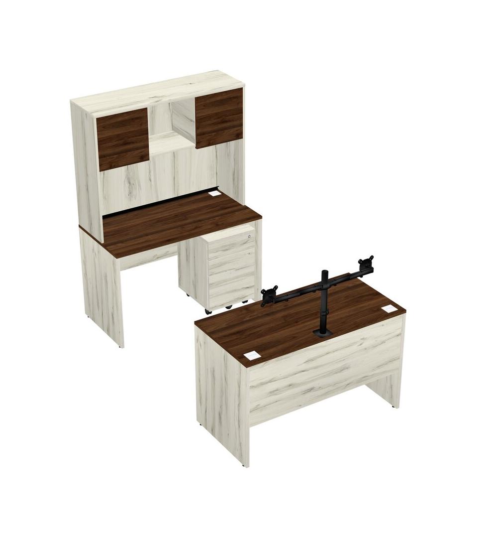 Office Parallel Desk Credenza Desk + Wooden Mobile Drawers + Hutch + Monitor Arm (double Arms)