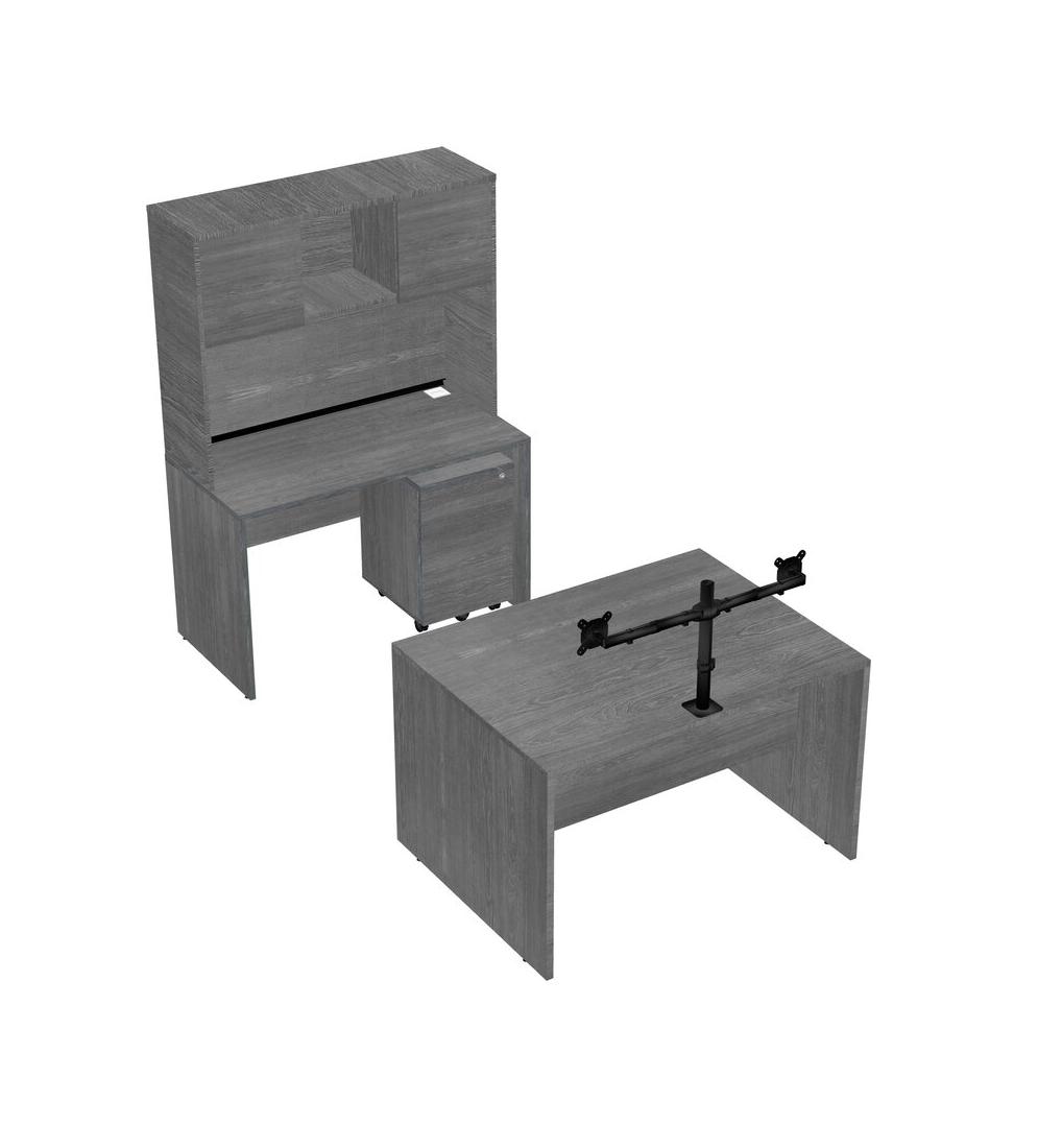 Office Parallel Desk Credenza Desk + Wooden Mobile Drawers + Hutch + Monitor Arm (double Arms)