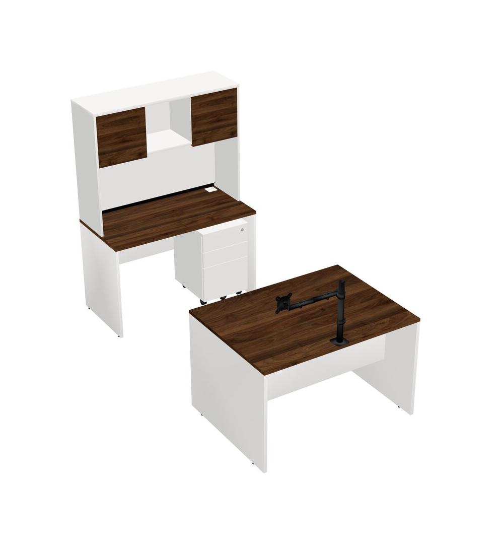Office Parallel Desk Credenza Desk + Wooden Mobile Drawers + Hutch + Monitor Arm (single Arm)