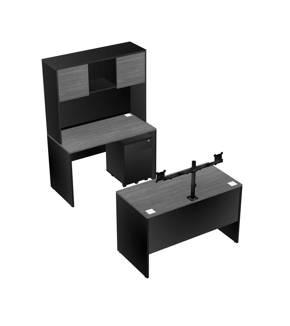 Office Parallel Desk Credenza Desk + Wooden Mobile Drawers + Hutch + Monitor Arm (double Arms)